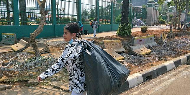 Memanggul Kantong Plastik, Awkarin Pungut Sisa Sampah di Depan Gedung DPR RI
